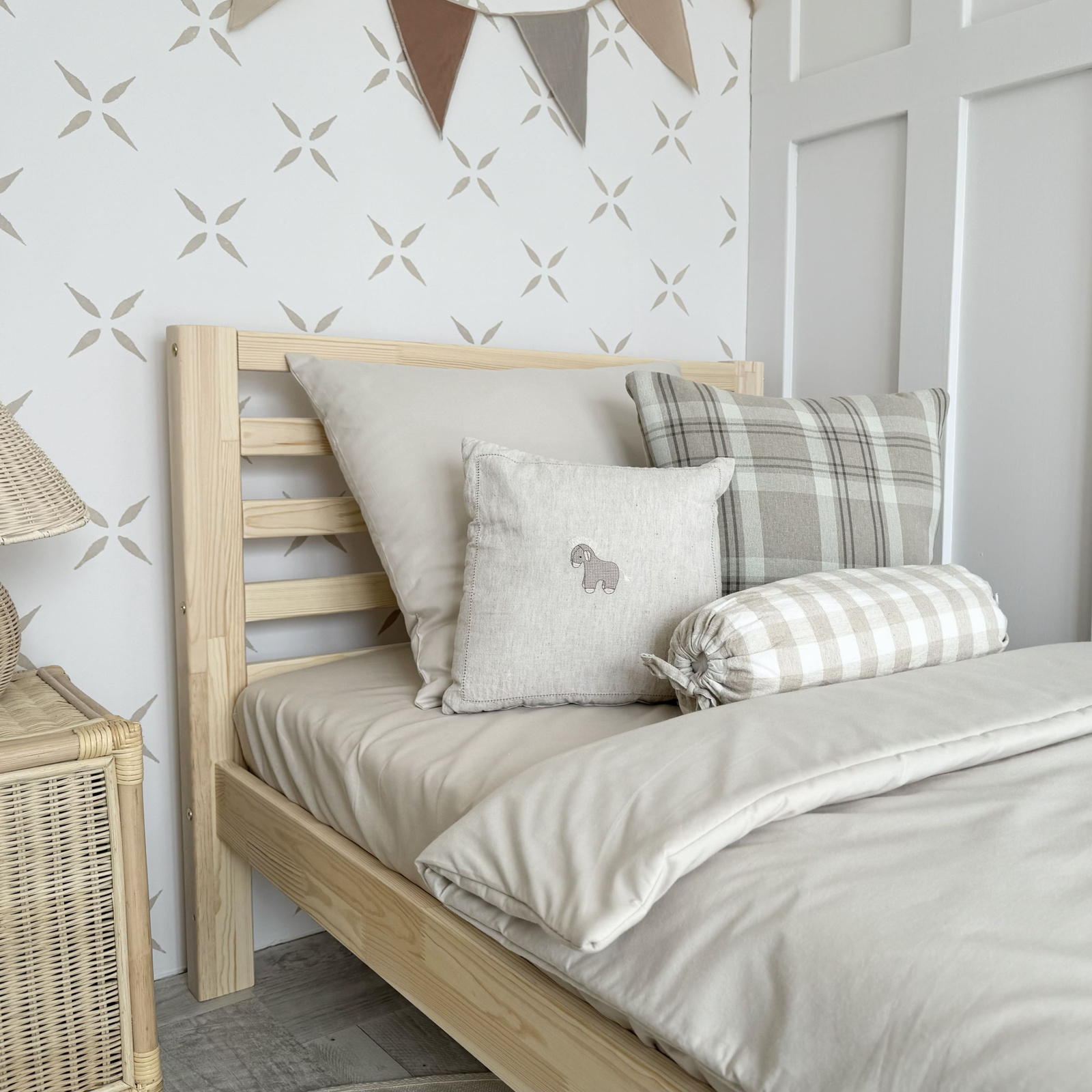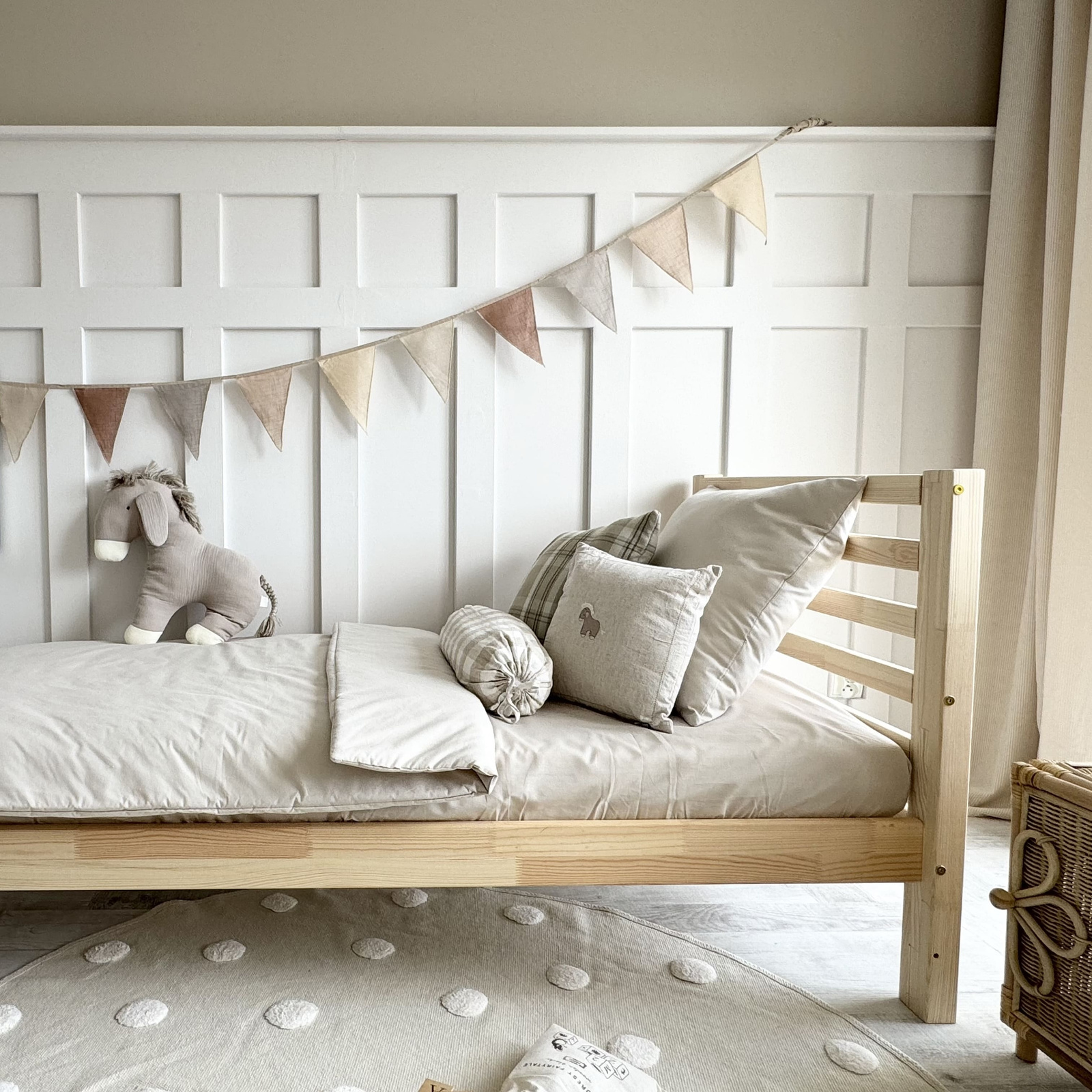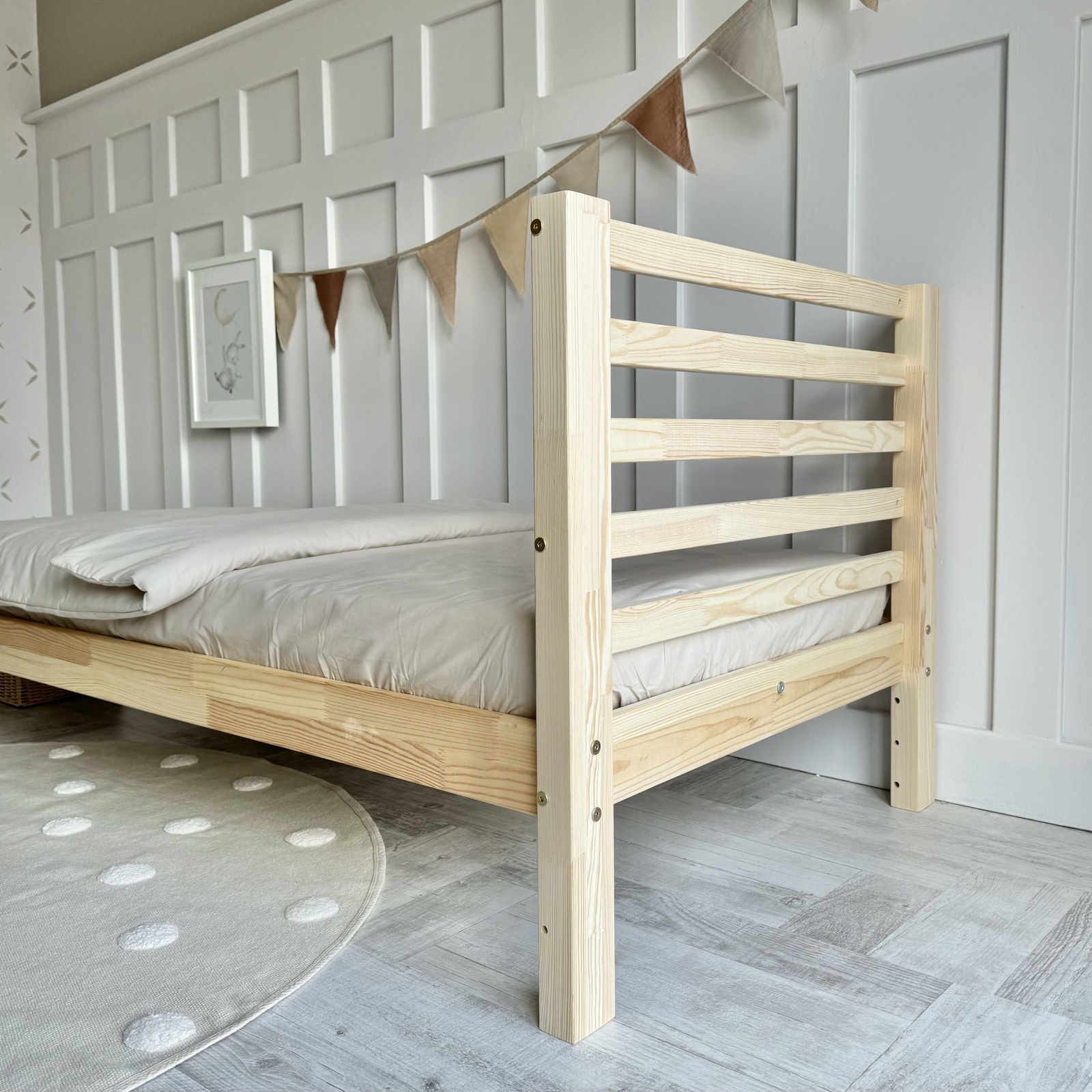 - Υλικό κατασκευής κρεβατιού: Κατασκευασμένο από μασίφ ξύλο πεύκου υψηλής ποιότητας, με αντοχή στην καταπόνηση και την φθορά.