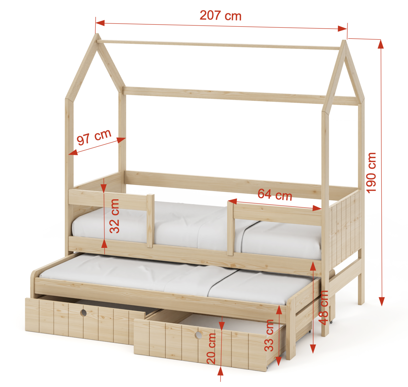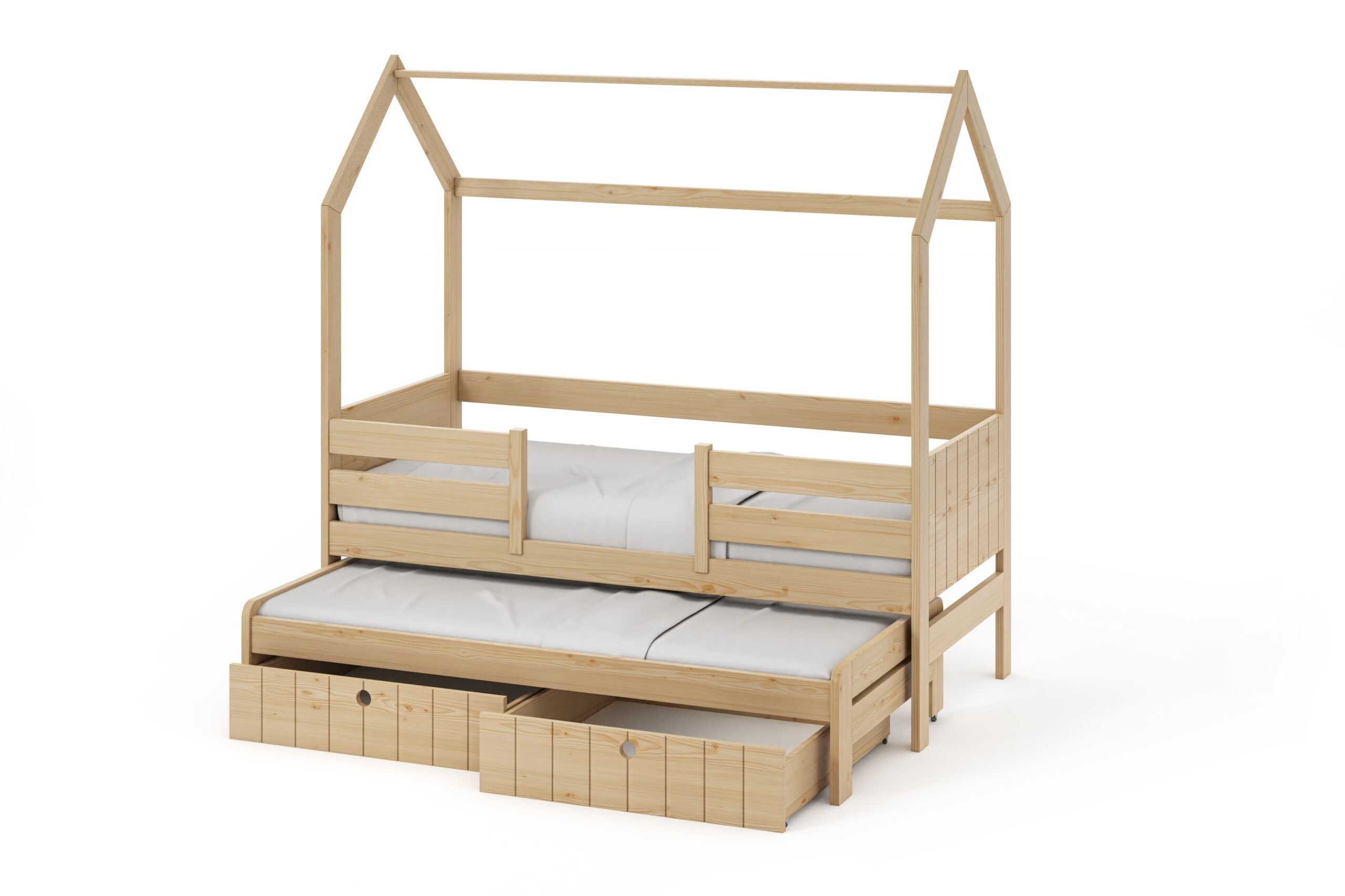 Ταυτόχρονα, το παιδικό κρεβάτι σπιτάκι με συρόμενο κρεβάτι ενσωματώνει δεύτερο συρόμενο κρεβάτι, το οποίο αποτελεί ιδανική λύση για φιλοξενία φίλων ή για αδέλφια που μοιράζονται το ίδιο δωμάτιο. Με αυτόν τον τρόπο, το κρεβάτι προσαρμόζεται στις καθημερινές ανάγκες της οικογένειας.