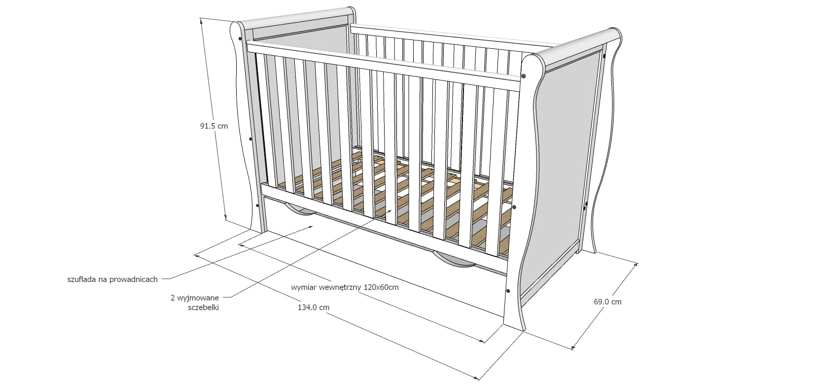 - Εξωτερική διάσταση κρεβατιού: Π69 x Μ134 x Υ91,5 cm