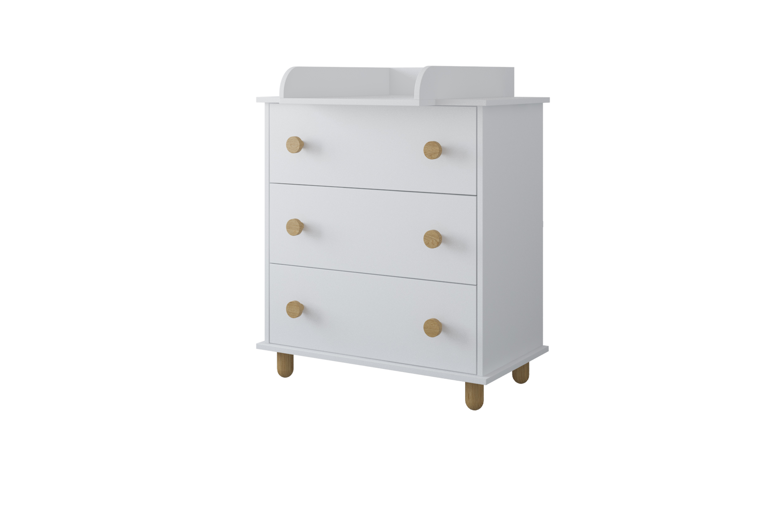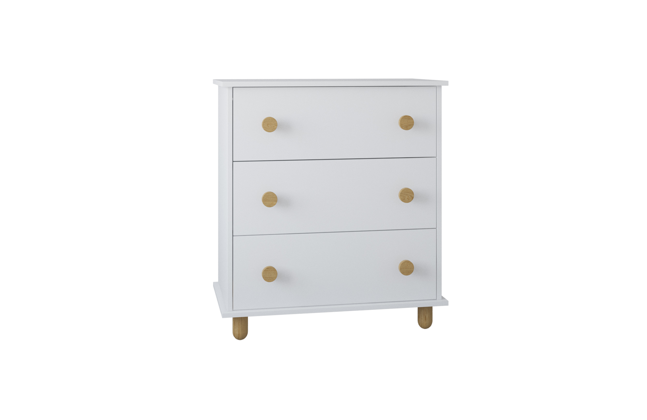 Η συρταριέρα Lumi ξεχωρίζει με τα στρογγυλά ξύλινα πόμολα και τα φυσικά ξύλινα πόδια, ενώ τα τρία ευρύχωρα συρτάρια οργανώνουν εύκολα τα ρούχα σας.