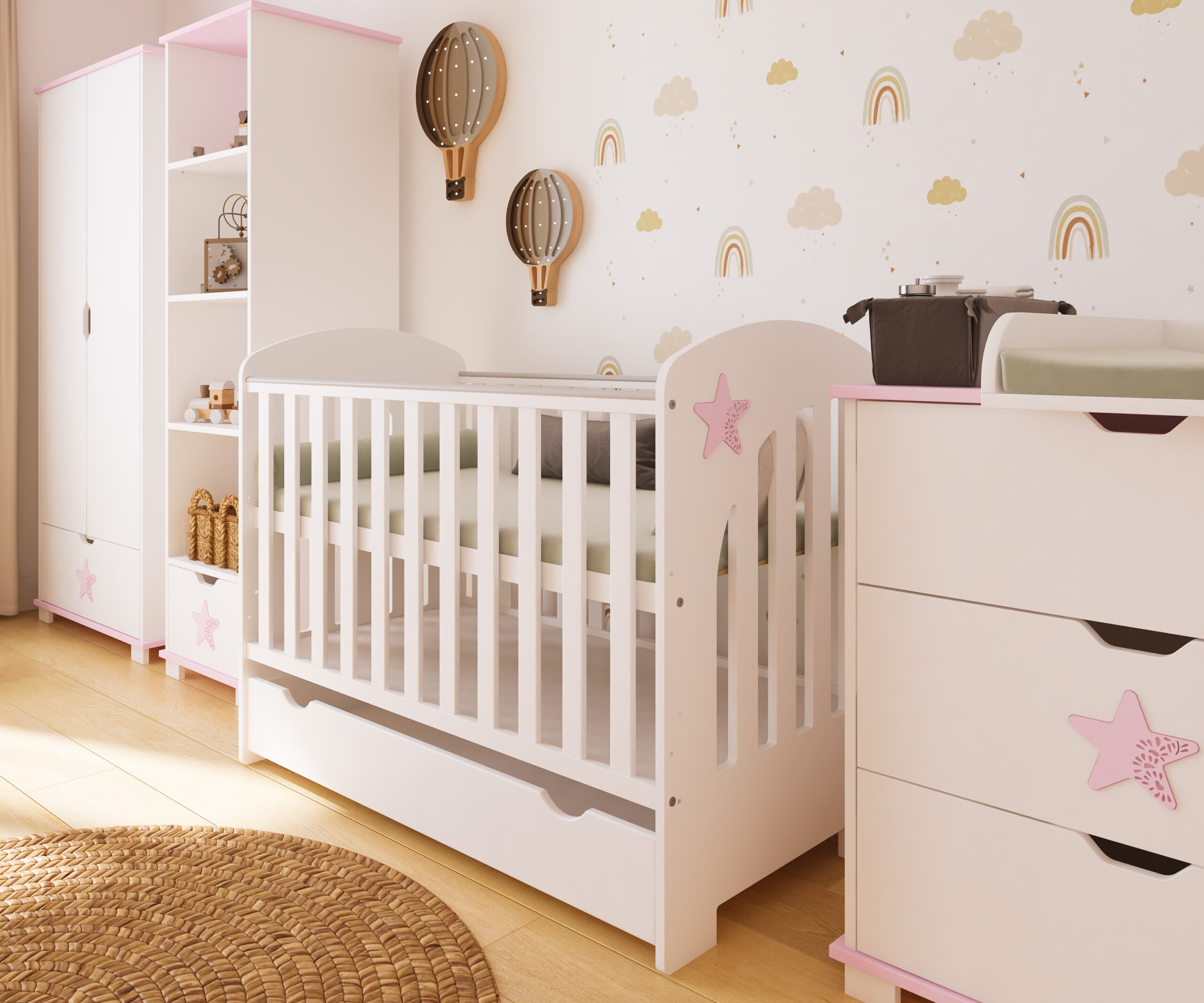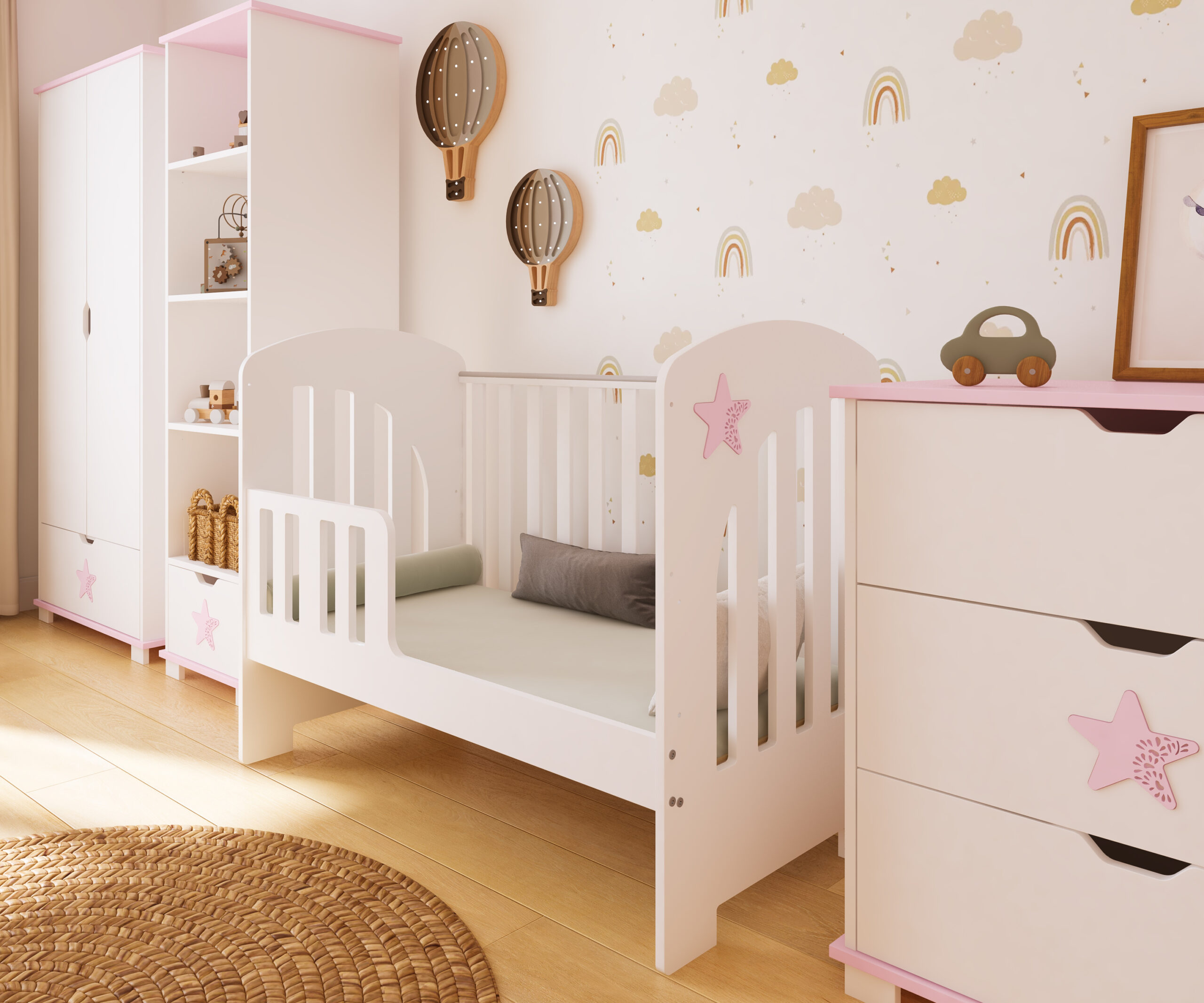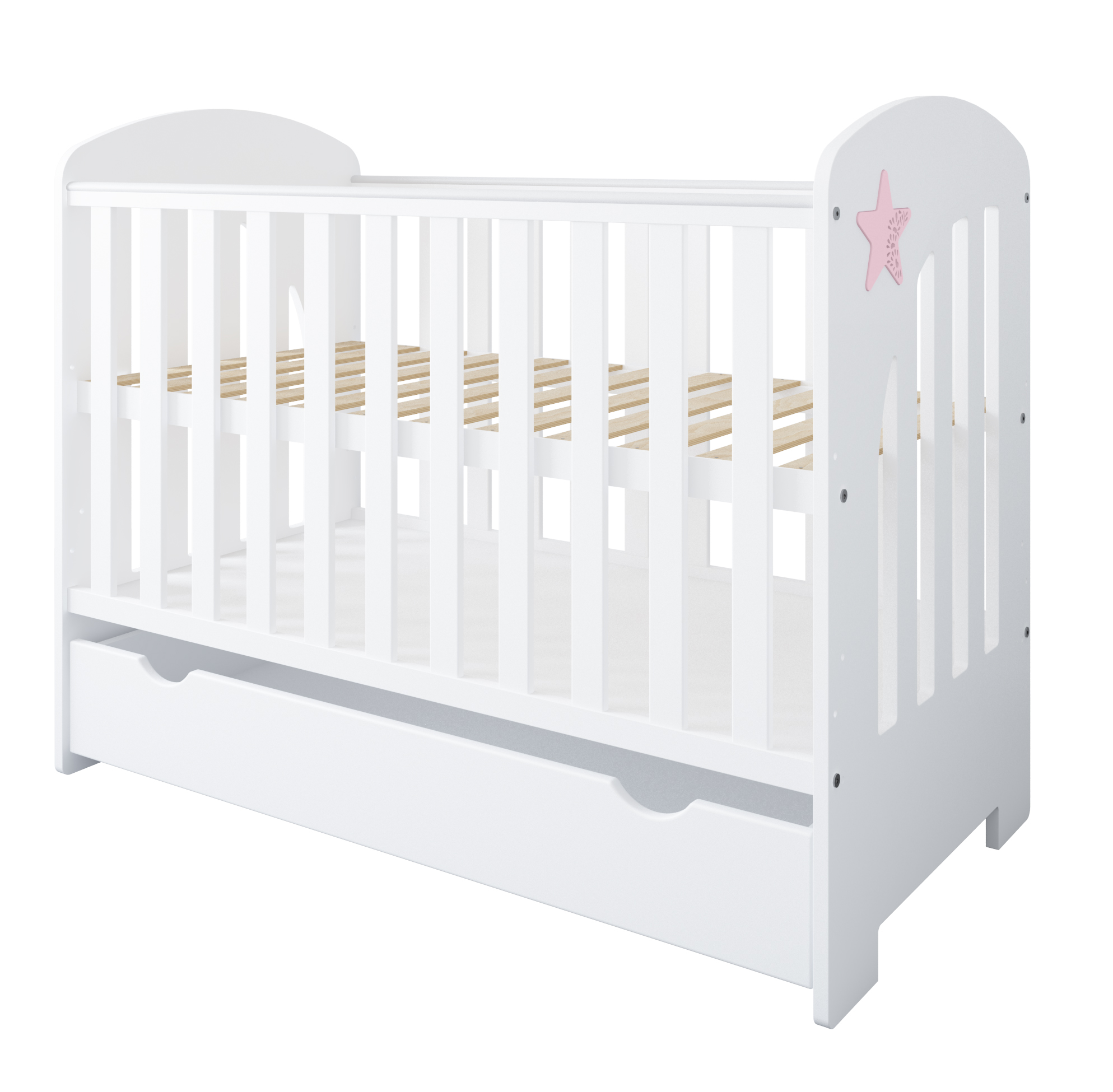 Το βρεφικό κρεβάτι Star 60×120 συρτάρι ροζ ξεχωρίζει για το λευκό χρώμα και το χαρακτηριστικό ροζ αστέρι στο κεφαλάρι. Το βρεφικό κρεβάτι Star 60×120 συρτάρι ροζ διαθέτει αποθηκευτικό συρτάρι με καπάκι, προστατευτικό κάγκελο και τρεις θέσεις ρύθμισης βάσης. Κατασκευασμένο από MDF & ξύλο πεύκου με οικολογικά χρώματα νερού, προσφέρει ασφάλεια και πρακτικότητα σύμφωνα με τις ευρωπαϊκές προδιαγραφές.