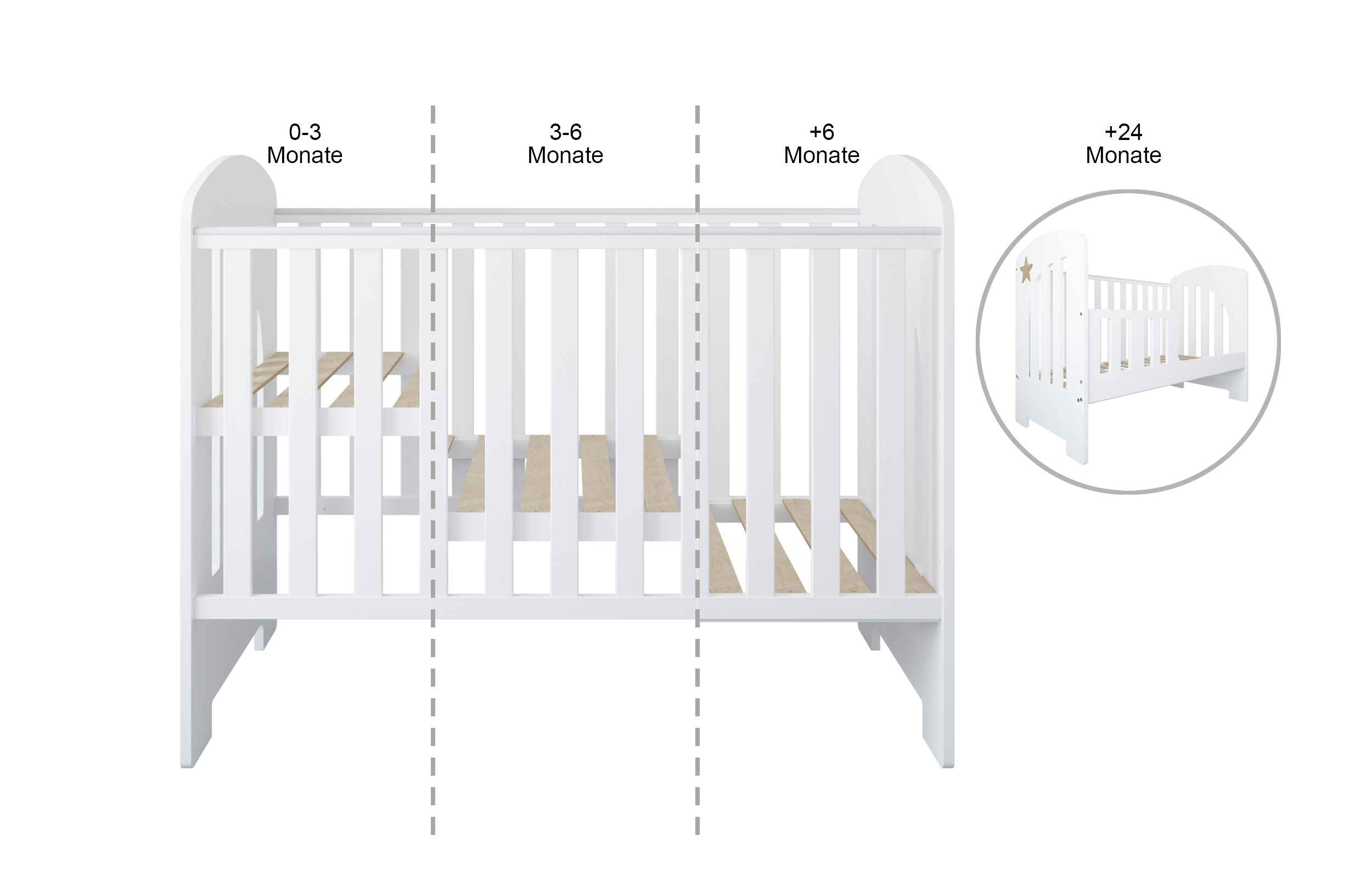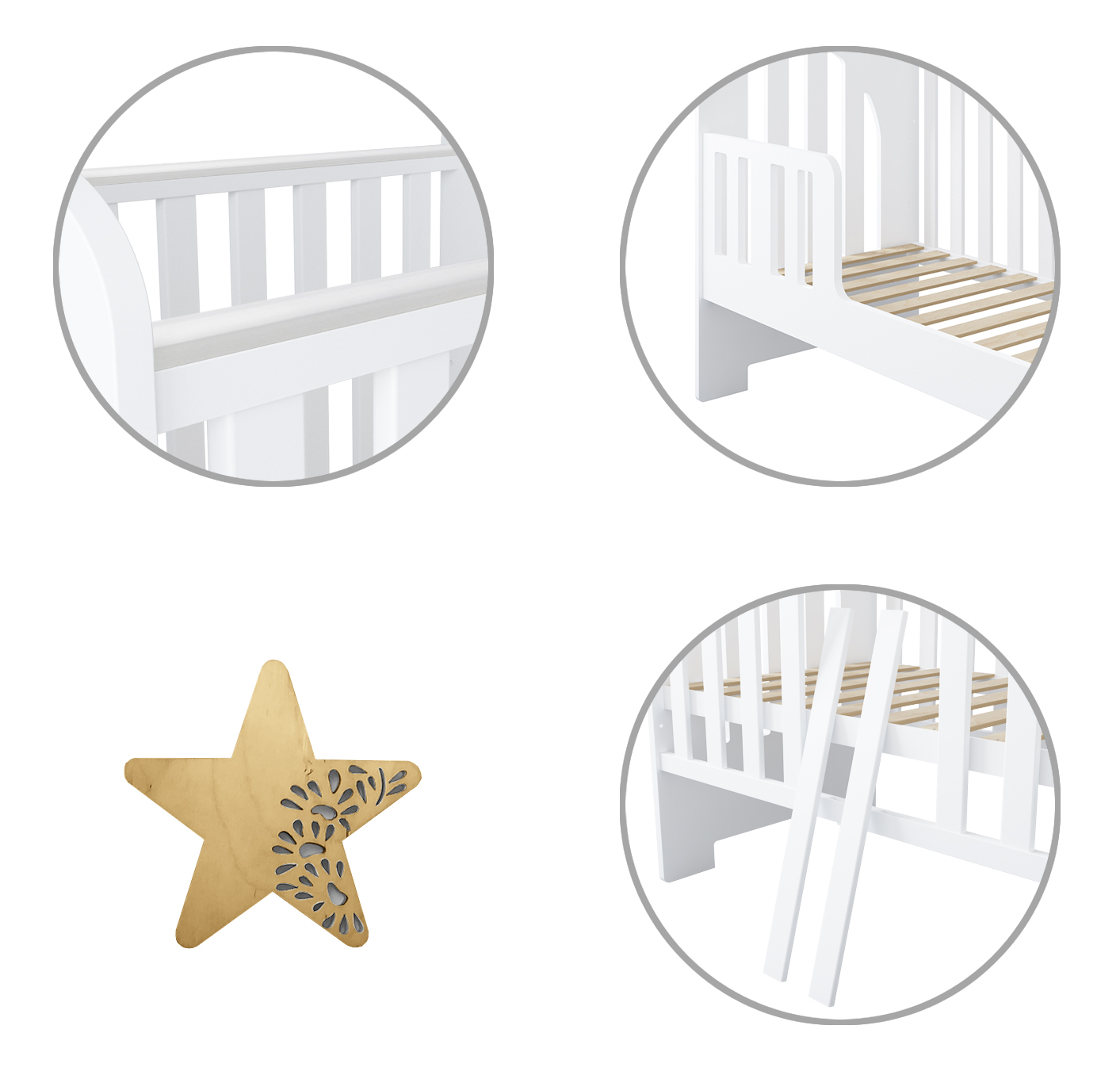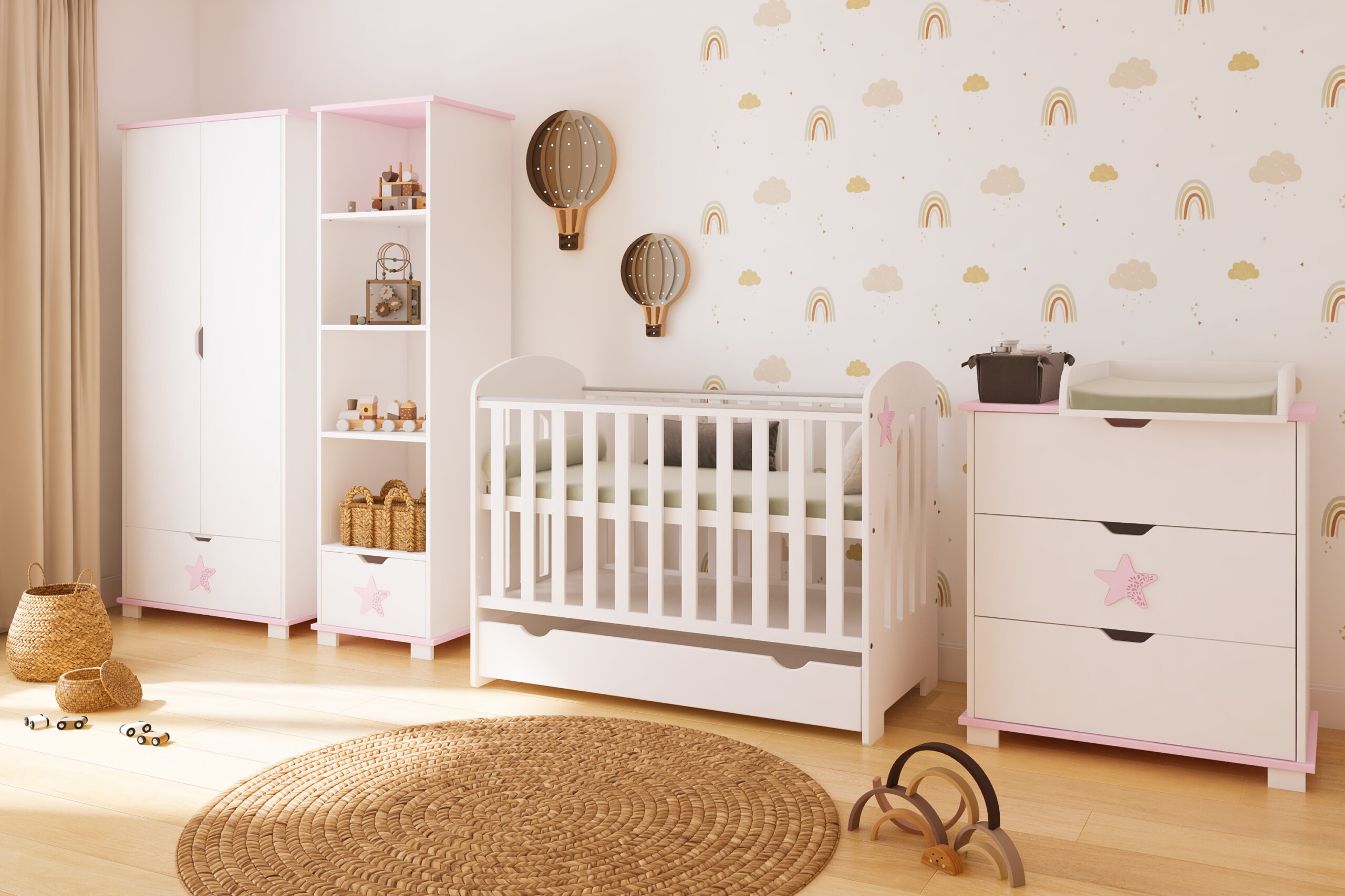 Το βρεφικό κρεβάτι Star 60×120 συρτάρι ροζ ξεχωρίζει για το λευκό χρώμα και το χαρακτηριστικό ροζ αστέρι στο κεφαλάρι. Το βρεφικό κρεβάτι Star 60×120 συρτάρι ροζ διαθέτει αποθηκευτικό συρτάρι με καπάκι, προστατευτικό κάγκελο και τρεις θέσεις ρύθμισης βάσης. Κατασκευασμένο από MDF & ξύλο πεύκου με οικολογικά χρώματα νερού, προσφέρει ασφάλεια και πρακτικότητα σύμφωνα με τις ευρωπαϊκές προδιαγραφές.