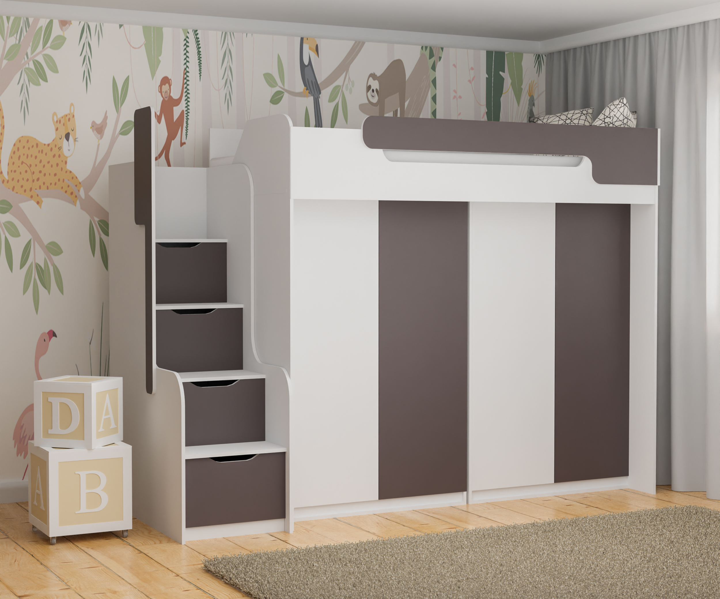 Υπερυψωμένο Κρεβάτι Dorian με Ντουλάπες & Σκαλοπάτια 90×200cm White & Trufel (Δώρο 10% Έκπτωση στο Στρώμα)