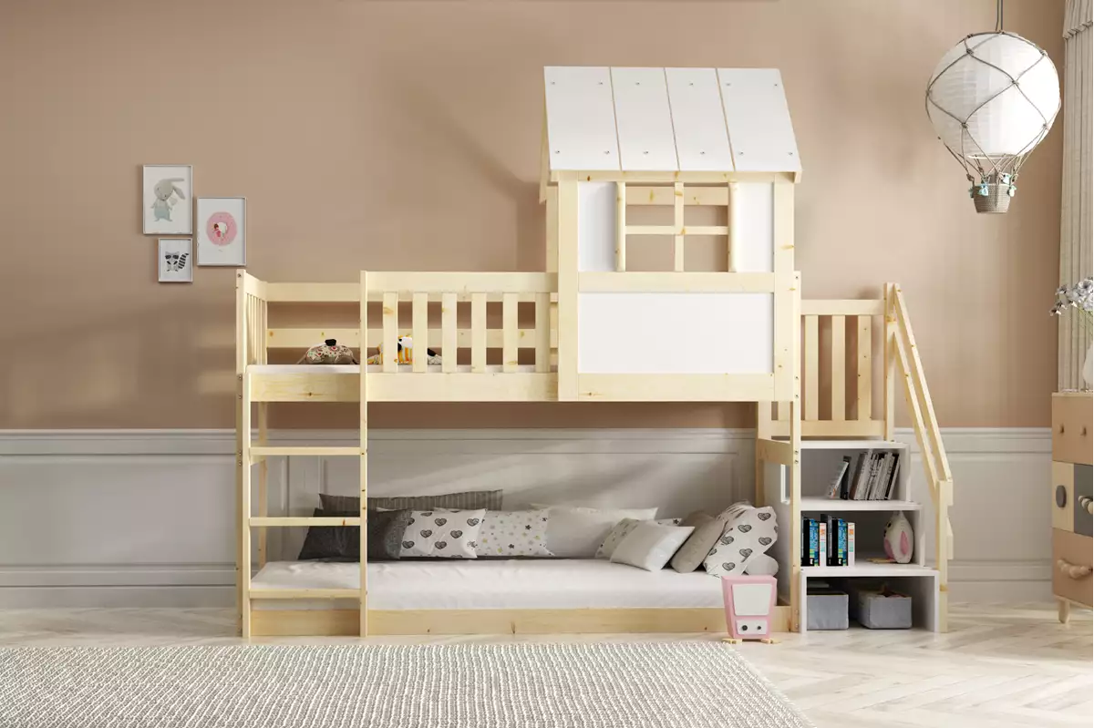 Παράλληλα, ο σχεδιασμός σε σχήμα σπιτιού, σε συνδυασμό με το παραθυράκι στο επάνω κρεβάτι, ενισχύει τη φαντασία των παιδιών και μετατρέπει τον ύπνο σε ευχάριστη εμπειρία. Επιπλέον, τα σκαλοπάτια με ενσωματωμένο αποθηκευτικό χώρο διευκολύνουν την πρόσβαση στο επάνω επίπεδο και προσφέρουν πρακτικές λύσεις οργάνωσης.